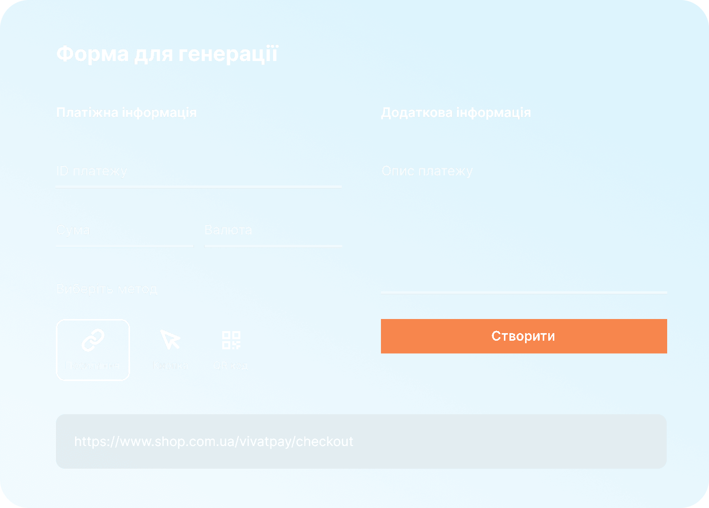 Перетворіть кожен запит на оплату з нашим універсальним генератором. QR-коди, платіжні посилання та кнопки - обирайте оптимальне рішення для миттєвих платежів і поліпшення клієнтського досвіду.